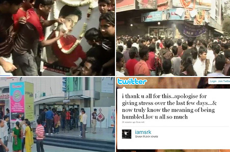 The Shiv Sena did try to intimidate audiences by sporadic protests outside Fun Cinemas in Versova and Chembur. The protestors were arrested immediately and hundreds of Shah Rukh's fans waited patiently to enter the cinemas. Their loyalty had already been appreciated by Shah Rukh who had tweeted on Friday morning, before the film opened, "good m'ing mumbai. wotever the fate of the film, never wished this upon the city that made my dreams come true & gave me all. i belong to u".. (Read: SRK tweets "for last time" on Sena controversy).